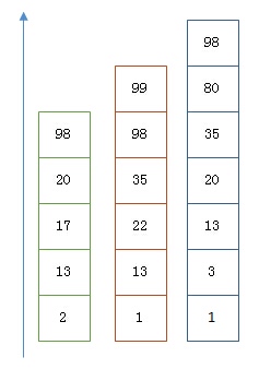 以上是三个posting list。我们现在需要把它们用AND的关系合并,得出posting list的交集。首先选择最短的posting list,然后从小到大遍历。遍历的过程可以跳过一些元素,比如我们遍历到绿色的13的时候,就可以跳过蓝色的3了,因为3比13要小。