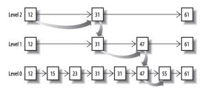 最后得出的交集是[13,98],所需的时间比完整遍历三个posting list要快得多。但是前提是每个list需要指出Advance这个操作,快速移动指向的位置。什么样的list可以这样Advance往前做蛙跳?skip list: