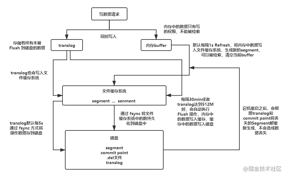 Refresh,将内存中的数据以一个新段形式刷新到文件缓存系统中并清空内存。这时虽然新段未被提交到磁盘,但是可以提供文档的检索功能且不能被修改。512M 或者时间超过 30 分钟时,会触发一次 Flush。内存中的数据被写入到一个新段同时被写入到文件缓存系统,文件系统缓存中数据通过 Fsync 刷新到磁盘中,生成提交点,日志文件被删除,创建一个空的新日志。ES 不仅要根据提交点去加载已经持久化过的段,还需要读取 Translog 里的记录,把未持久化的数据重新持久化到磁盘上,避免了数据丢失的可能。
